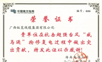 全國電線電纜產(chǎn)品質(zhì)量監(jiān)管AA級企業(yè),全國重合同守信用單位,廣西“二十五”電線電纜產(chǎn)業(yè)重點扶持企業(yè),國家強(qiáng)制性產(chǎn)品CCC認(rèn)證
